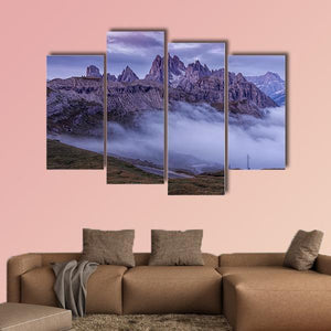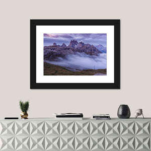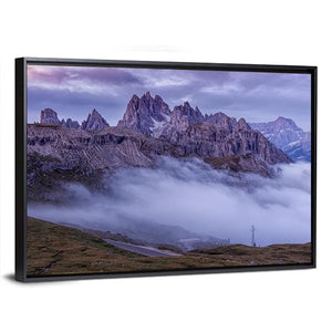 Sunrise on the Dolomites places a fog-laced mountain range front and center, with jagged peaks pushing through rolling fog under a purple-gray sky. The realistic print carries a mysterious, dramatic and serene mood. It suits modern or nature-inspired rooms as a calm, contemplative focal point.