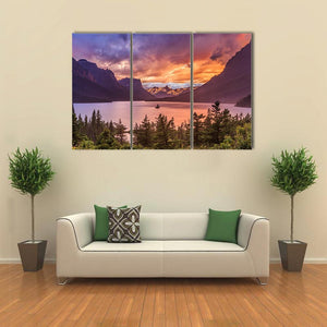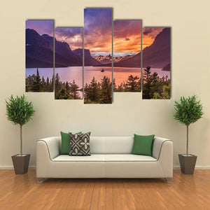 This landscape canvas art captures a serene sunset over St Mary Lake, framed by majestic mountains and pine trees. The dramatic colors of purple, orange, and pink evoke a peaceful atmosphere, making it a captivating addition to any nature lover's décor.