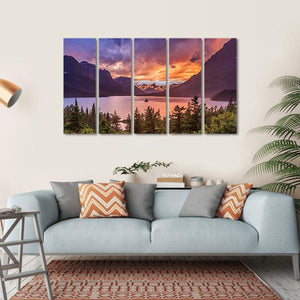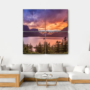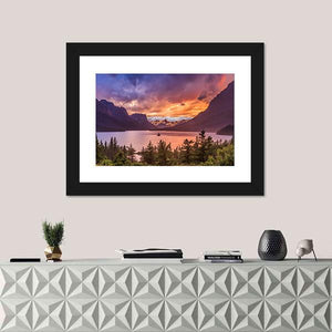 Experience the serene beauty of St Mary Lake, where a dramatic sunset casts vibrant hues of orange and purple across the water. This stunning landscape features snow-capped mountains and evergreen trees, creating an awe-inspiring scene that captures nature's tranquility.
