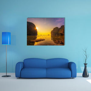Sunset At The Maya Beach depicts coastal cliffs and a calm ocean beneath a warm, sunburst sunset in vibrant yellows, oranges, purples and blues. The rule-of-thirds composition and realistic, vibrant style create a serene, peaceful mood that fits modern or coastal room decor.