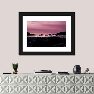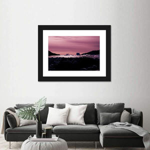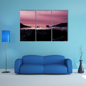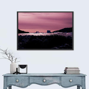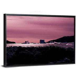 This canvas art captures the serene beauty of icebergs floating in a tranquil ocean at dusk. With a palette of purple and pink against a cloudy sky, it evokes a cool and majestic atmosphere, ideal for modern decor.