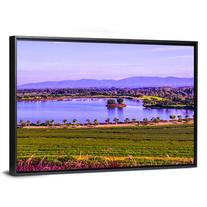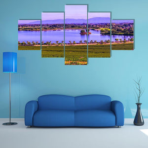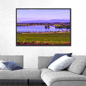 Tea Plantation With Lake Canvas captures a peaceful landscape of rolling tea fields beside a calm lake with a small island and distant mountains. Soft blues, greens and hints of purple give it a serene, natural feel that suits modern or nature-inspired interiors.