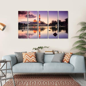This canvas wall art features the serene Tengku Zaharah Mosque, beautifully reflected in water against a stunning sky. The palette of purple, orange, and yellow creates a peaceful atmosphere, making it an exquisite addition to your décor.