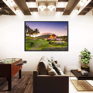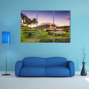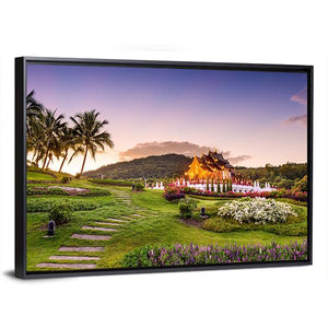 Royal Flora Ratchaphruek Park Canvas Wall Art depicts a realistic tropical garden scene: a stone path leads through lush vegetation toward a lit temple, with palm trees and distant mountains. A sunset palette of purple, green, yellow, pink and white gives the view a serene, slightly magical mood. This canvas print suits home room decor where calm, natural imagery brings a gentle focal point.