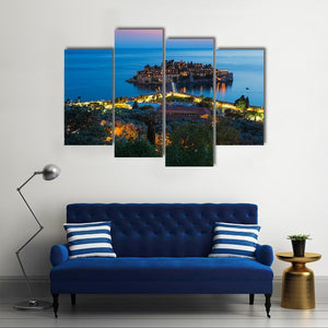 The Island of Sveti Stefan Canvas Wall Art shows an island village connected by a bridge at twilight, with illuminated buildings, darkened foliage and a blue‑orange sunset sky. Its realistic, scenic look creates a serene, romantic atmosphere that works well in coastal or modern rooms as a calm focal piece.