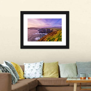 Cliffs Of Kerry Canvas Wall Art depicts coastal cliffs, the ocean and a wide, cloud-streaked sky in a palette of purple, blue, green and warm orange. The rule-of-thirds composition and details like rolling waves and a grassy cliff face create a serene yet dramatic mood that hints at sunrise or sunset light. It works well in modern or coastal-inspired rooms as a nature-focused wall piece.