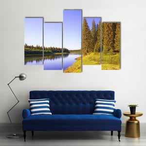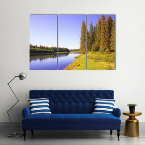 A calm, realistic view of a river shore with forest and grass, anchored by tall evergreen trees on the right bank and soft reflections in the water. The composition follows the rule of thirds and uses blue, green, yellow and brown tones for a serene, natural atmosphere. It fits well in modern or nature-inspired rooms.