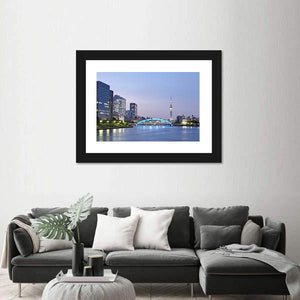 This canvas art captures a serene Tokyo skyline, featuring a striking blend of blue, purple, and grey hues. The illuminated bridge and distant tower add a modern touch, making it a beautiful piece for urban decor.