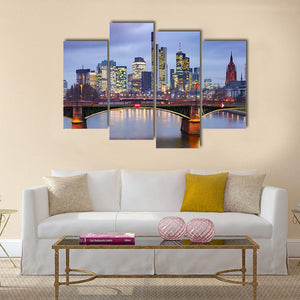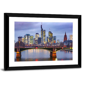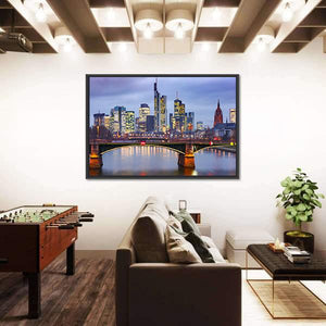 View of Frankfurt’s skyline and bridge reflected in the river, captured in a wide, eye-level cityscape. The modern canvas uses blue and grey dusk tones with yellow-orange lights and water reflections to create a vibrant urban evening mood, suitable for living rooms or offices.