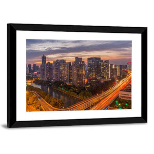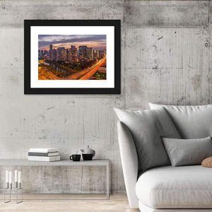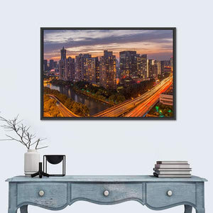 View of Hangzhou’s city skyline with river and highway, shown from an aerial perspective at twilight with lights from buildings and cars. The blue, orange, yellow, gray and white palette creates an energetic, urban mood. Suited to modern living rooms or office walls as city-focused wall decor.