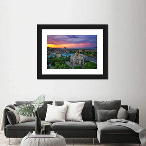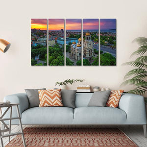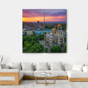 This canvas art features an aerial view of the stunning Cathedral of Assumption in Varna, Bulgaria. The vibrant palette of orange, purple, and yellow, along with the golden domes and red tiled roofs, create a serene and awe-inspiring scene. It beautifully captures the essence of this historic church against a backdrop of dramatic clouds and lush green trees.