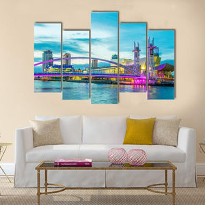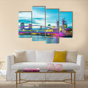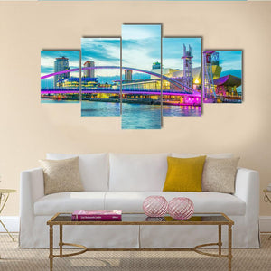 A vibrant cityscape focused on the Lowry Theater and the illuminated bridge along Manchester’s waterfront. Pink and purple lights reflect across the water, creating a modern, energetic evening scene that suits contemporary or urban interiors.