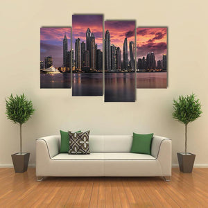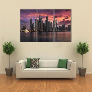 Dramatic, vibrant view of a city skyline and waterfront in the Dubai Marina, with a yacht resting on reflective water. Purple, pink and orange sunset tones blend with deep blues and black silhouettes for a serene, cinematic mood. Works well in modern living rooms or contemporary offices as wall decor.