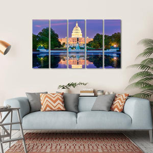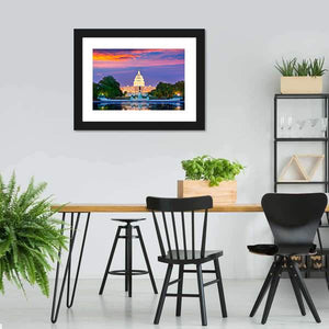 This canvas features the iconic Capitol Building, reflecting gracefully in water surrounded by trees and a serene sky. With a rich palette of sunset colors, it evokes a peaceful and majestic atmosphere, making it a beautiful addition to any wall decor.