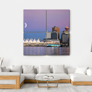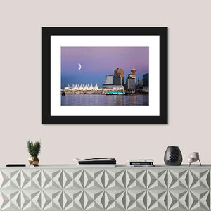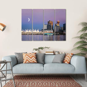 This modern cityscape art piece captures a tranquil harbor scene at dusk, featuring majestic buildings reflected in calm waters under a crescent moon. The serene palette of blues, purples, and hints of orange adds a soothing touch to any wall.