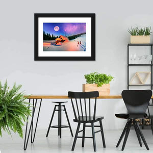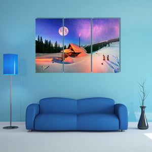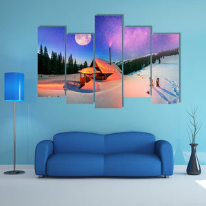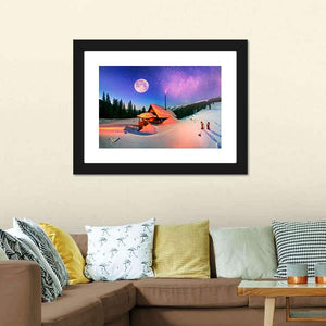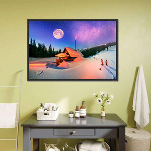 A snowy cabin sits beneath a full moon and starry night, smoke curling from the chimney for a quietly magical scene. The blue, purple and pink palette with dramatic night lighting gives a serene, peaceful, cold mood—suitable for modern living rooms, bedrooms or a cabin retreat.