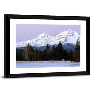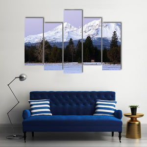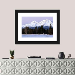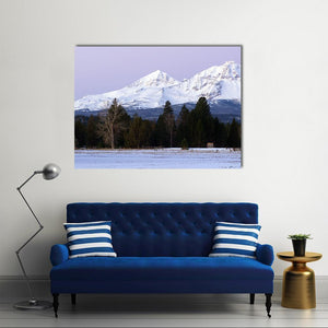This horizontal canvas art beautifully captures the serene majesty of snowy mountains, framed by a pine forest and a winter field. The cold, blue tones evoke a peaceful atmosphere, making it a perfect addition to nature-inspired decor.