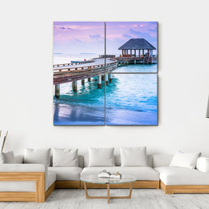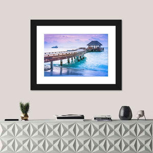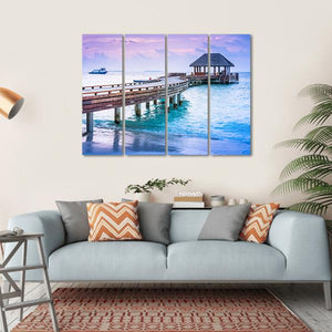 Experience the serene beauty of a wooden pier stretching into the tranquil blue sea of the Maldives. This photorealistic canvas captures a peaceful moment at sunset, with pink and purple clouds reflecting on calm waters, accentuated by a distant boat on the horizon.