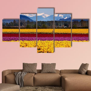 Spring Tulip Field with Snow-capped Mountains Canvas Wall Art