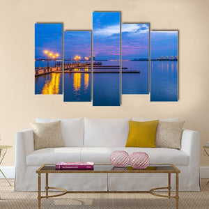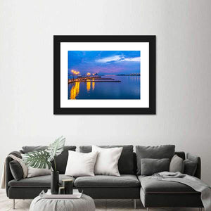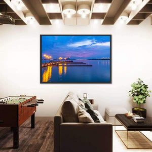 Yixing Shiqiao Lake View captures a calm pier and lake at twilight, with lights reflecting on the water and dramatic clouds overhead. The blue, purple, yellow and orange palette gives a serene, tranquil mood. Its modern landscape look fits contemporary living rooms or bedrooms.