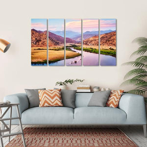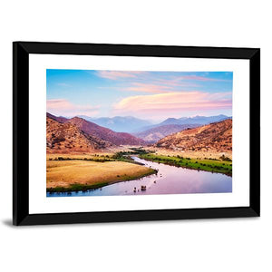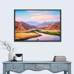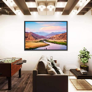 This canvas artwork captures the serene beauty of Yosemite National Park at sunset, featuring tranquil rivers and distant mountains framed by wispy clouds. The rich blues, pinks, browns, and greens evoke a picturesque landscape, perfect for enhancing any space with a calming vibe.
