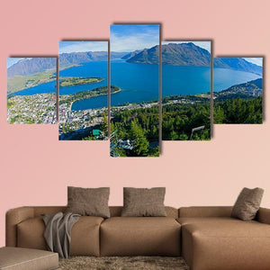 Queenstown and Lake Wakatipu unfold in a panoramic, high-angle landscape showing the lake, mountains, town and a cable car beneath a clear blue sky. The realistic image feels serene and vast, with blues, greens, browns and tree-covered hills. Suits modern or nature-themed rooms, such as living rooms and offices, as a calm focal piece.