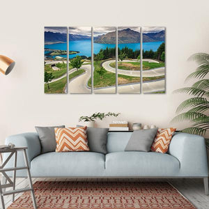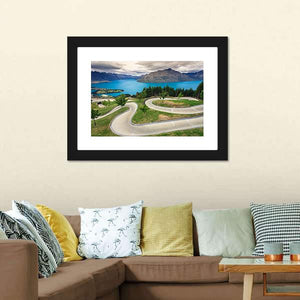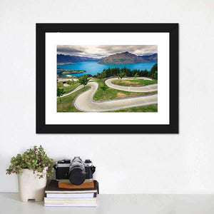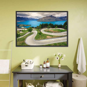 Explore the winding road and serene lake nestled among majestic mountains in this realistic canvas piece. The inviting palette of blues and greens evokes a sense of adventure amidst New Zealand's breathtaking landscapes.