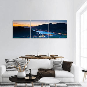 This panoramic canvas captures Queenstown’s mountains, lake, and town at dusk, with the town lights twinkling across the shoreline. A blue and orange palette gives a tranquil yet vibrant feel, suitable as a calm focal piece for modern interiors.
