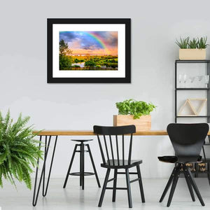 Bring the beauty of the Kentucky countryside to your walls with this vibrant canvas art. Featuring a rainbow arching over a serene lake, framed by lush trees and rolling hills, it evokes a peaceful and hopeful atmosphere. This artwork complements a variety of decor styles, making it a lovely addition to any room.