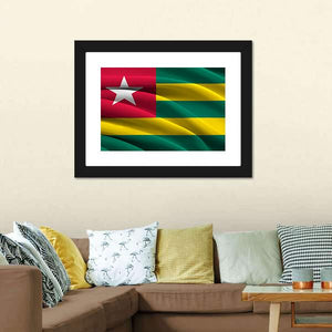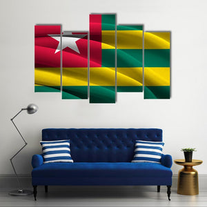 Waving Togo Flag Canvas Wall Art presents the Togo flag with a textured, wavy fabric effect and a bold, patriotic palette of red, green, yellow, and white. The composition emphasizes symmetry and modern style, offering a vibrant focal piece for home walls. It pairs well with contemporary room decor in living rooms, hallways, or home offices.
