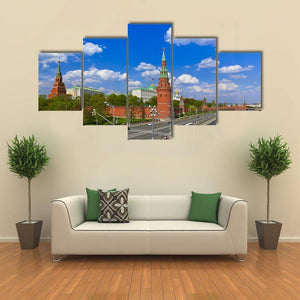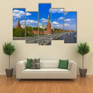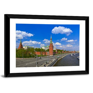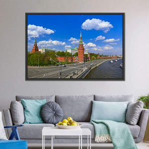 This canvas art captures the iconic Kremlin towers along the Moscow River, showcasing a vibrant cityscape filled with historical charm. The bright colors and photorealistic detail create an inviting scene that adds life to any wall.