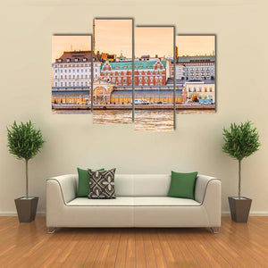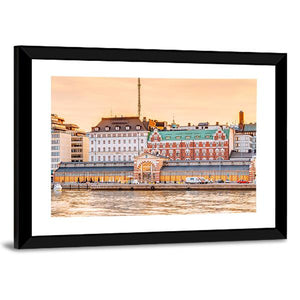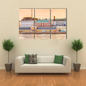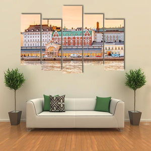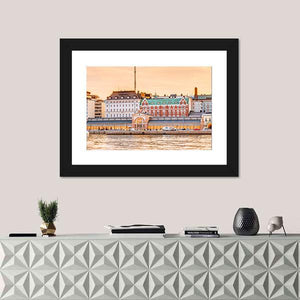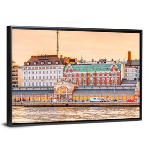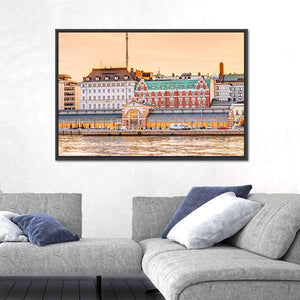 This canvas wall art features a serene cityscape of ornate building facades along a calm waterfront, set against a daytime sky. The vibrant palette of orange, blue, red, and green evokes a warm summer atmosphere, making it a captivating piece for any wall.