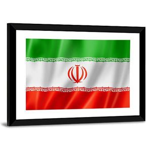 This canvas shows the flag of Iran, including its emblem and Arabic script, in a bold green, white, red and black palette. Its symmetrical, modern composition gives a nationalistic, iconic presence that fits modern home decor.