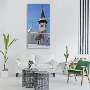 A realistic, peaceful depiction of a church in winter, with snow on the roof and ground, bare tree branches, and a clock tower showing red clock faces. The blue-and-white palette creates a serene, wintry atmosphere that works well in living rooms, entryways, or quiet faith spaces.