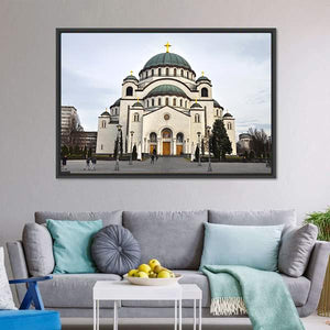 Saint Sava Church Canvas Wall Art depicts the church’s domes, columns and arched doorways in a symmetrical, classical composition that reads as grand and serene. The white, green and gold palette, with visible golden crosses on the domes, suits traditional or modern home wall decor — good for living rooms or entryways.