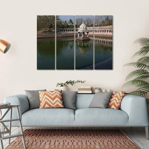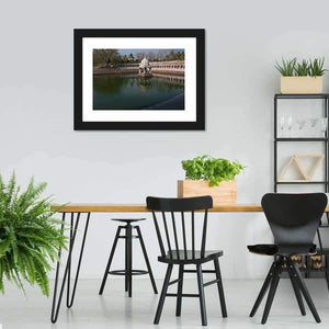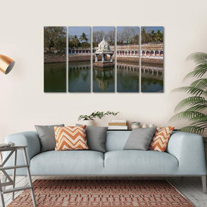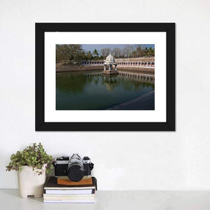 This canvas art beautifully captures the serene reflection of Ekambareswarar Temple in Kanchipuram. Featuring a stunning white domed structure surrounded by lush greenery and a tranquil pond, it evokes a peaceful and spiritual atmosphere.