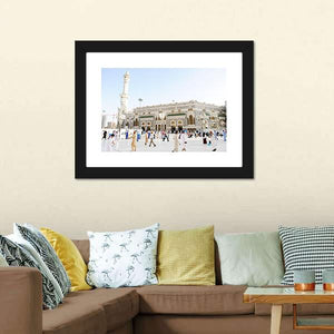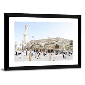 This canvas art beautifully captures the mosque and minaret of Mecca, bustling with pilgrims in white clothing against an ornate backdrop. The photorealistic depiction showcases the serene yet grand atmosphere of this holy city.