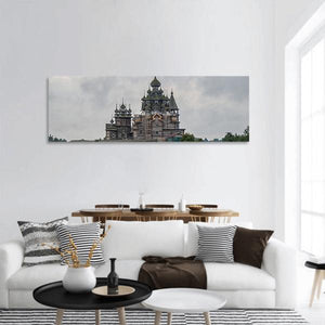 Kizhi Pogost in Russia depicts historic wooden churches with multiple domes in a panoramic, centered composition. Rendered realistically in muted grays, browns, greens, and whites beneath an overcast, serene sky, the print emphasizes intricate wooden construction and traditional architecture. It suits traditional or modern neutral rooms as contemplative wall decor.