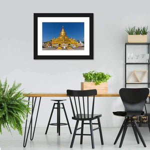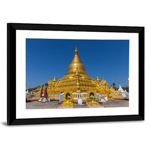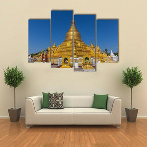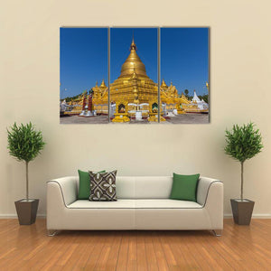 A photorealistic canvas print of Kuthodaw Pagoda in Mandalay, centered on an ornate golden stupa with multiple smaller stupas under a clear blue sky. The scene reads serene and majestic in gold, blue, and white tones, suited to modern living rooms or quiet meditation corners.