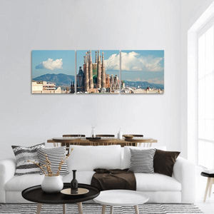A photorealistic panoramic canvas of La Sagrada Familia and the Barcelona skyline, with the cathedral’s distinctive spires under a partially cloudy sky. The scene feels grand, historic, and bright, rendered in blues, whites, browns, greens, and greys. Suits modern interiors looking for an architectural cityscape as room decor.