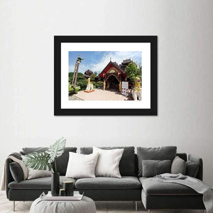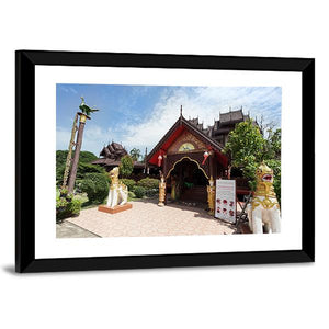 This photorealistic canvas shows the entrance of Nantaram Temple in Thailand, with ornate temple architecture and two guardian lion statues along a paved walkway. Warm browns and golds with green and blue accents create a cultural, contemplative mood that suits a living room or entryway.