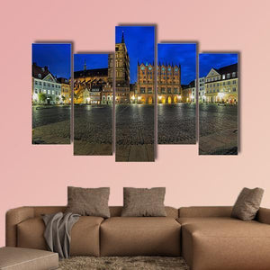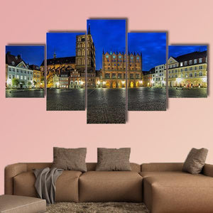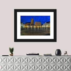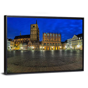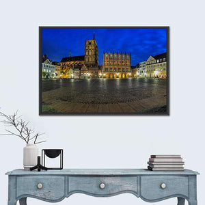 A realistic depiction of Old Market Square in Germany, showing a quiet town square with ornate facades, a church tower and cobblestone paving in deep blues, warm yellows and soft greys. The evening-calm mood suits classic or modern interiors looking for a historic, grounded focal point.