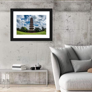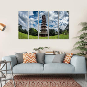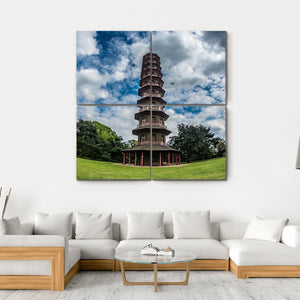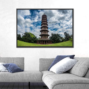 Bring a touch of serenity to your space with this photorealistic canvas featuring a multi-tiered pagoda surrounded by lush trees and fluffy clouds. The tranquil palette of greens and blues captures the beauty of nature, making it a wonderful addition to any room.