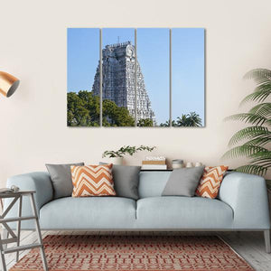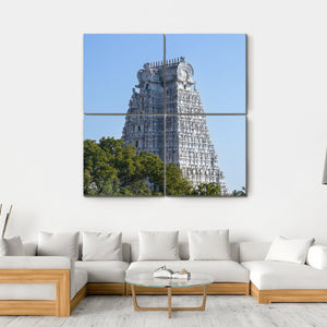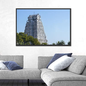 This canvas wall art features the majestic temple tower of Sri Rangam, surrounded by serene trees and a clear blue sky. The photorealistic details highlight the ornate carvings, making it a stunning piece for your wall decor.