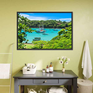 Experience the beauty of a tropical bay in this vibrant canvas art featuring anchored boats and lush greenery under a bright blue sky. This idyllic scene captures the serene essence of coastal life, making it a perfect addition to your wall decor.
