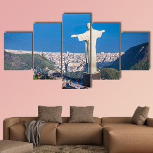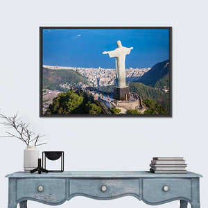 An aerial, photorealistic view of Christ the Redeemer overlooking Botafogo Bay and the city of Rio de Janeiro. Bright blues and lush greens create a scenic, sunny, and iconic mood that suits modern living rooms or entryways.