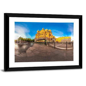 This majestic depiction of a historic church captures the grandeur of its golden domes and the reflective wet pavement beneath. The vibrant blues and yellows of the sky add a serene atmosphere, making it a captivating focal point for any room.