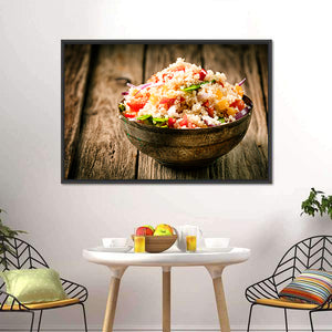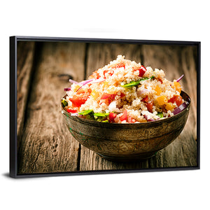 This canvas art features a close-up of a heaped bowl of quinoa salad, showcasing an appetizing arrangement of fresh ingredients. Its rustic style and warm color palette of brown, red, green, and yellow create a healthy and inviting atmosphere.