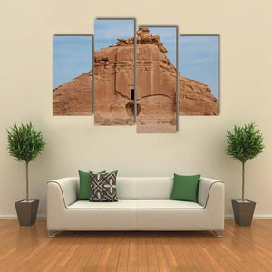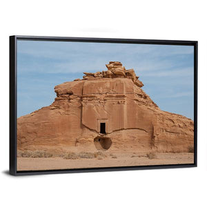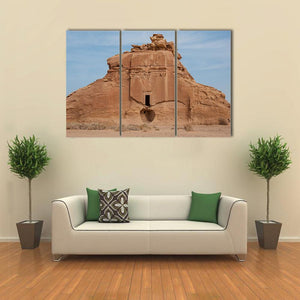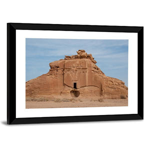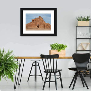 This landscape artwork features an ancient tomb carved into the rock, set against a desert backdrop. The earthy tones of orange and brown, paired with the blue sky, evoke an imposing and timeless atmosphere.