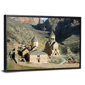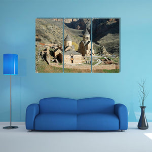 This landscape canvas art features a serene view of a historic monastery set against majestic mountains and a peaceful valley. The warm palette of tan, brown, and green enhances the tranquil atmosphere of this artwork.